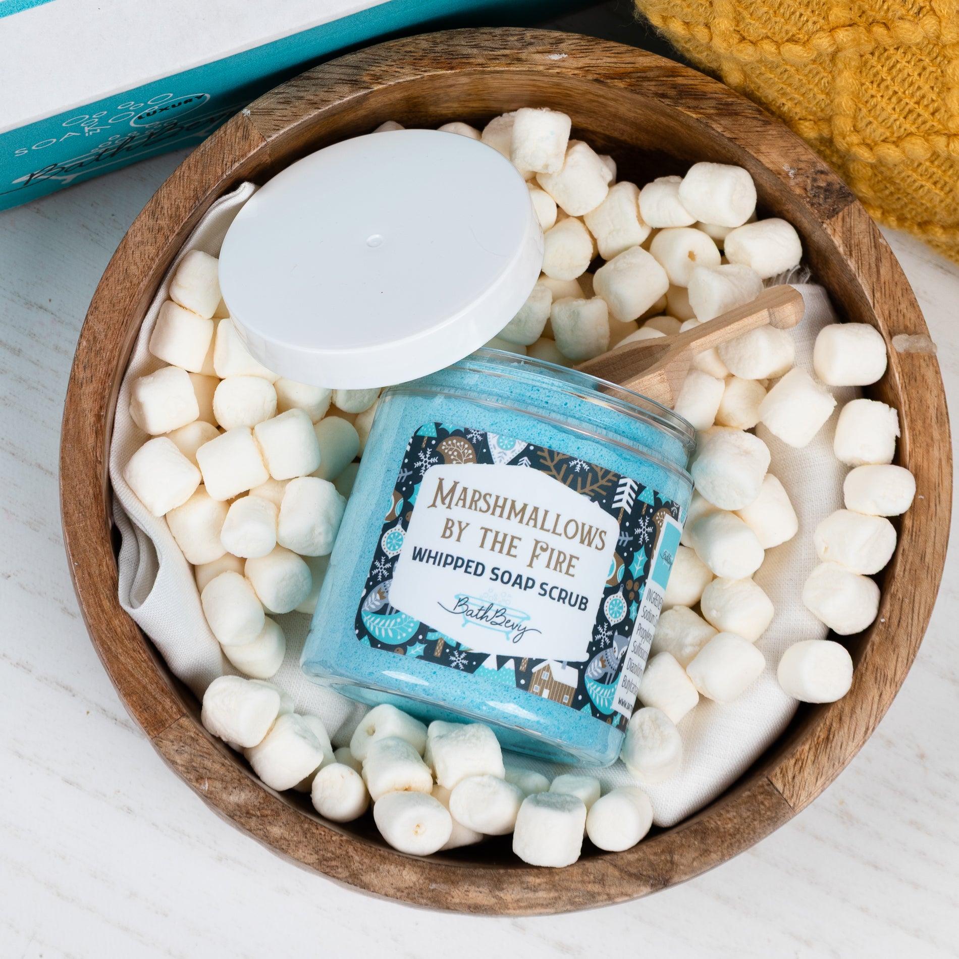 Jar of 'Marshmallows by the Fire' whipped soap scrub surrounded by mini marshmallows in a wooden bowl.