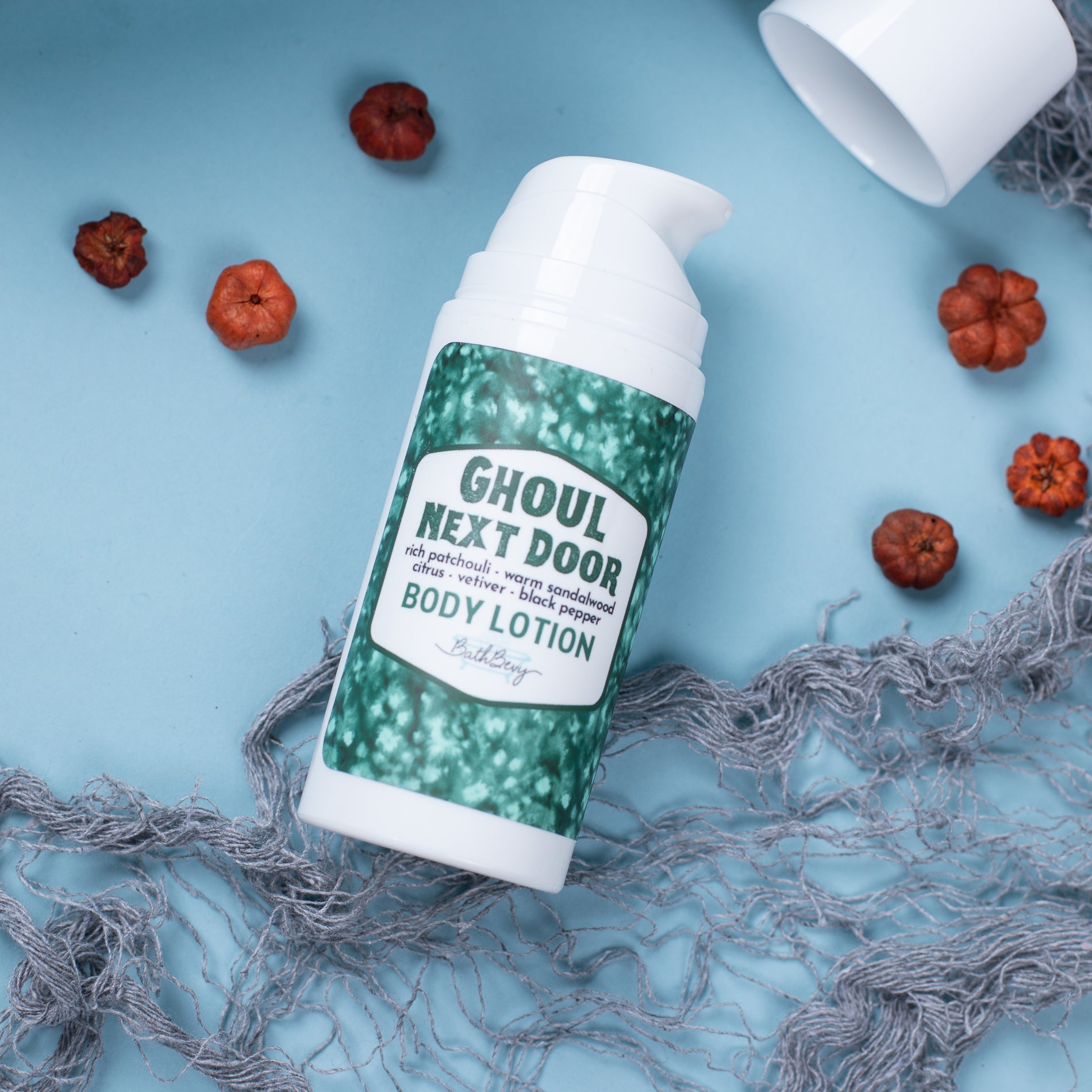 GHOUL NEXT DOOR BODY LOTION Keep dry skin at bay with this super cute Body Lotion. This scent combines rich patchouli, warm sandalwood, citrus, vetiver, and black pepper to make this comforting and mischievous fragrance.