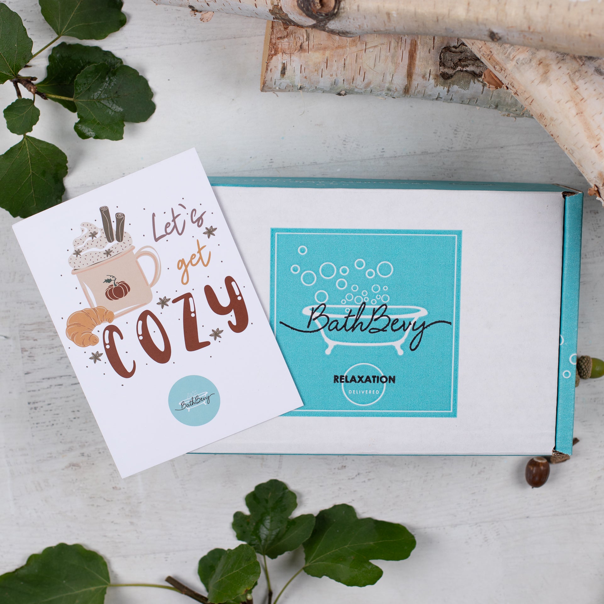 Open box with a 'BathBerry' label and a 'Let's get cozy' card on a light gray surface.